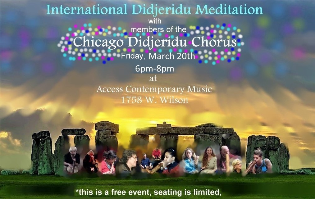The Worldwide Didjeridu Meditation happens on the equinox and solstice dates at local sunset times. The wave of healing sound follows the sunset around the world as a global prayer for world peace. Members of The Chicago Didjeridu Chorus have been the Chicago link to this chain for the past 30 years. Please join us for this wonderful and necessary opportunity to raise the vibration of the planet with this prayer for world peace.